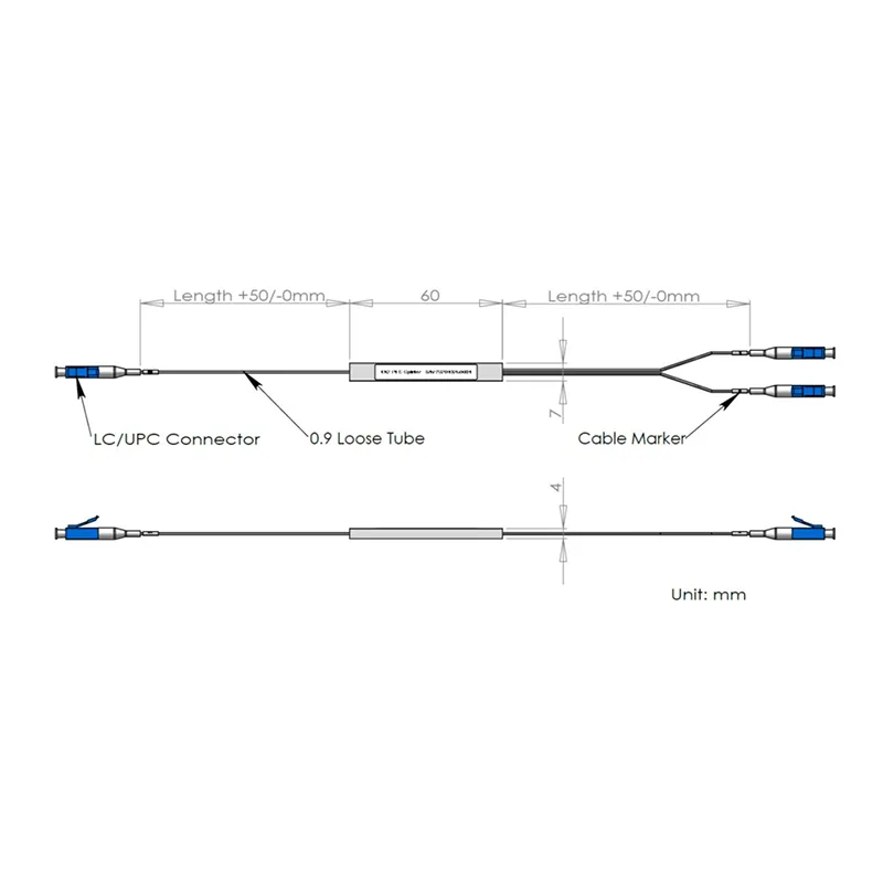 1 × 2 PLC skirstytuvo plieno vamzdžių pakuotė 60x7x4mm, su 900 μm laisvu vamzdžio ilgiu 1,0m, LC/UPC jungtis.