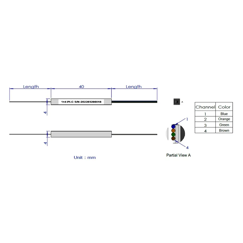 1x4/1 × 8 PLC skirstytuvo plieninio vamzdžio pakuotė 40x4x4mm, su 250 μm pliku pluoštu 2,5 +0,1/-0m, nėra jungties.