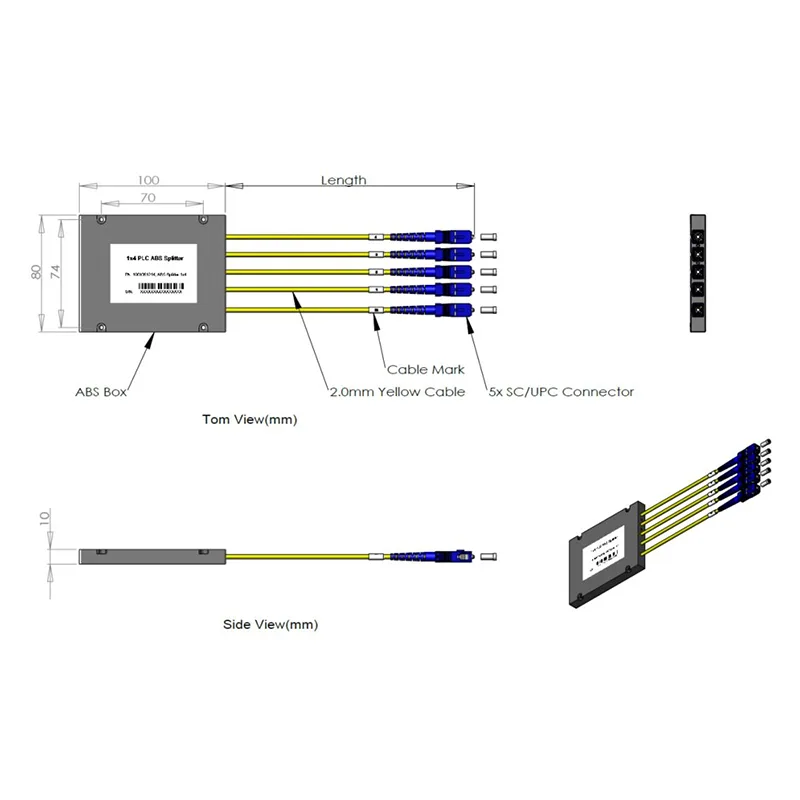 1x4 Planinės „Lightwave“ grandinės kasetės skirstytuvo paketas 100x80x10mm, φ2.0 geltonas PVC kabelio ilgis 2.0 +0,1/-0m, 5pcs SC/UPC jungtis.